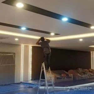 - จัดทำฝ้าฉาบเรียบฝ้าหลุมไฟ ใส่ไฟ LED เส้นและไฟดาวน์ไลท์